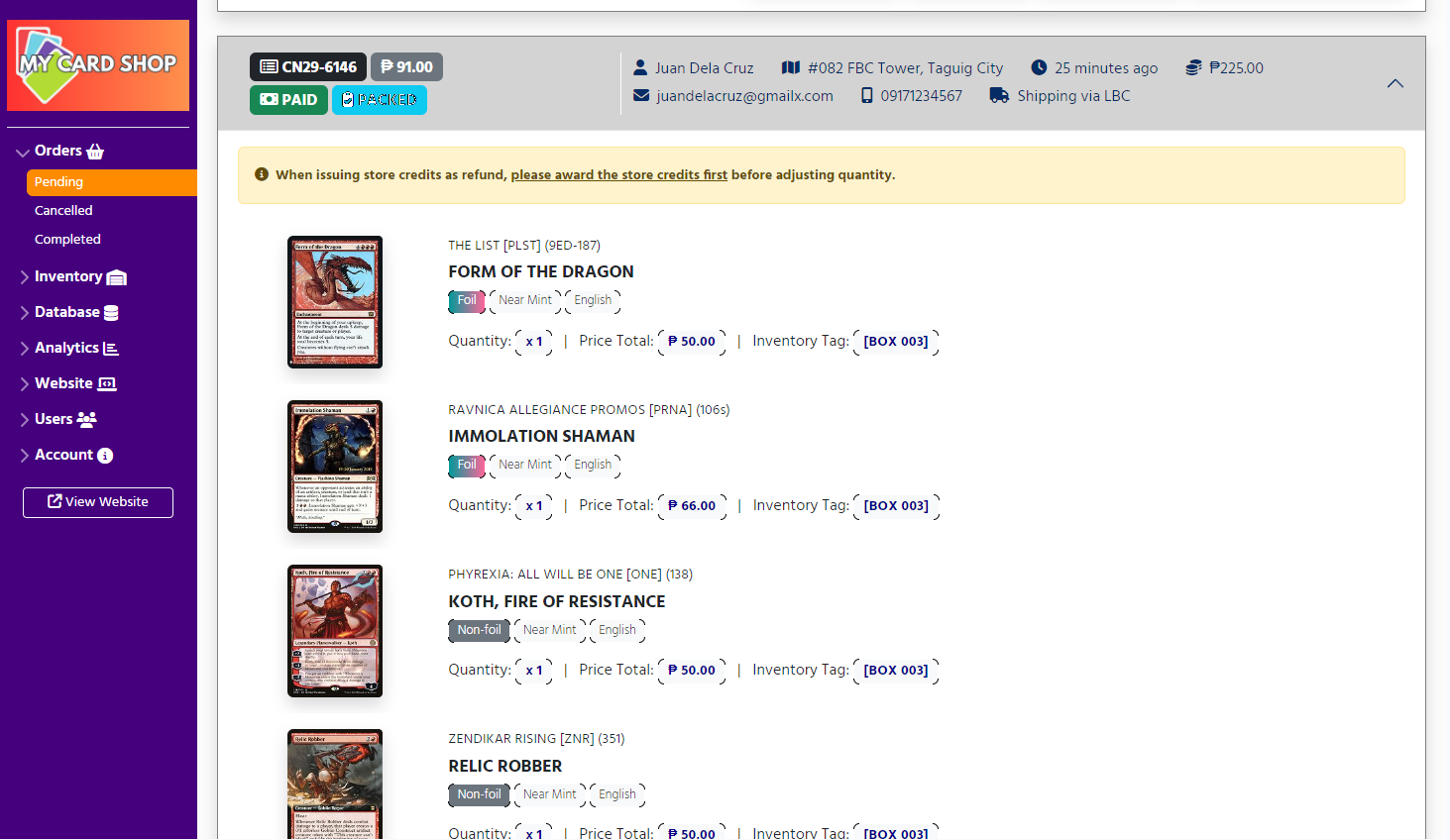 A: You can set an expiration time for unpaid orders (Ex. 24 hours). Once expired, orders are automatically moved to your Cancelled Orders dashboard, and their respective item quantities are automatically returned to the pool. (Ex. The unpaid order contains two pieces of Lightning Bolt. Once the order expires, those two cards are returned to the pool and becomes ready to be purchased again).